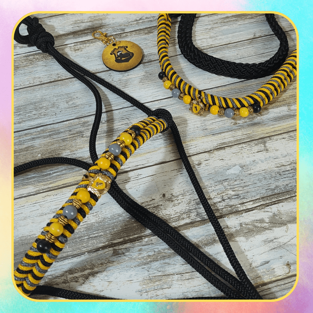"Ensemble Sorcier" jaune (licol, cordelette et médaillon) en taille cob