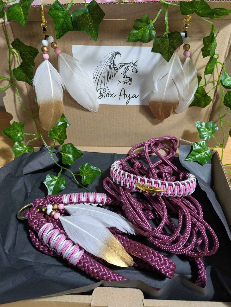Box avec un licol, 2 bijoux plumes, une cordelette ainsi qu'un bijou plume sur l'anneau