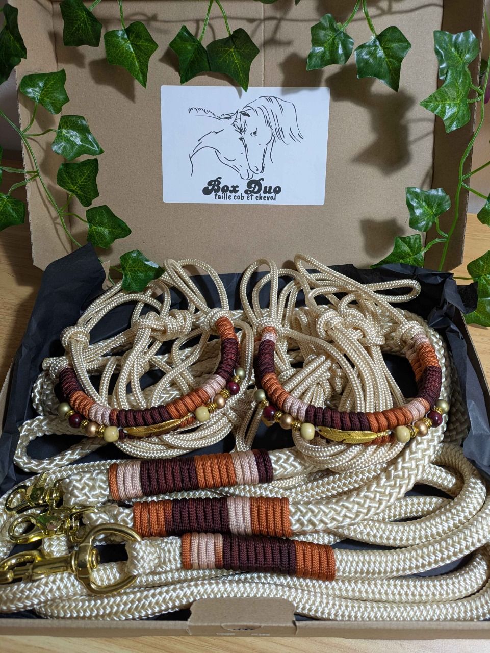 Box avec deux licols, un taille cob et un taille cheval avec une paire de rênes en corde plate et une longe de 2m50 en corde ronde avec mousqueton laiton