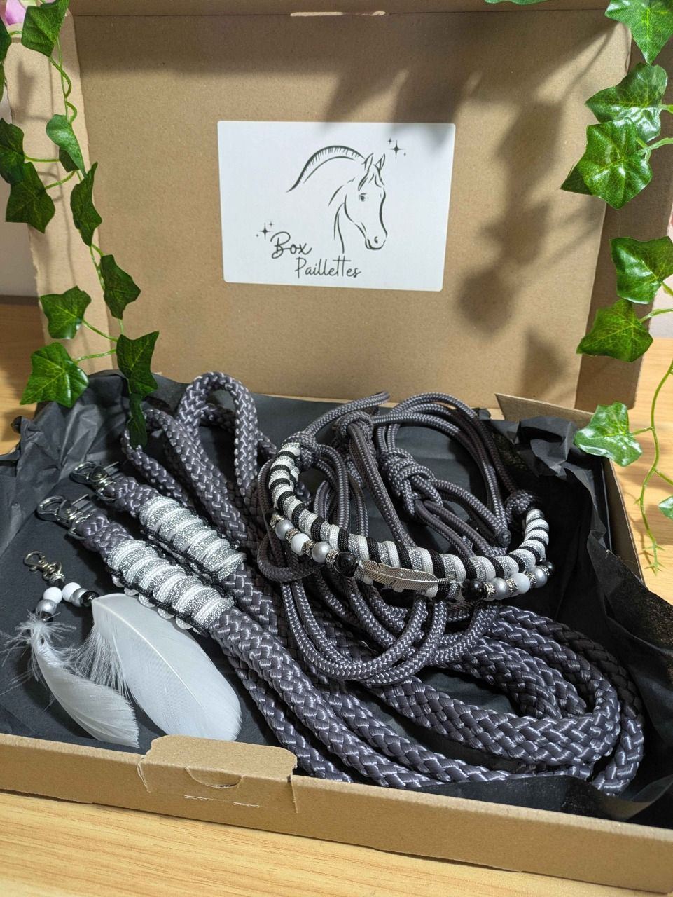 La box contient: un licol, une paire de rênes en corde plate ainsi qu'un bijou plumes