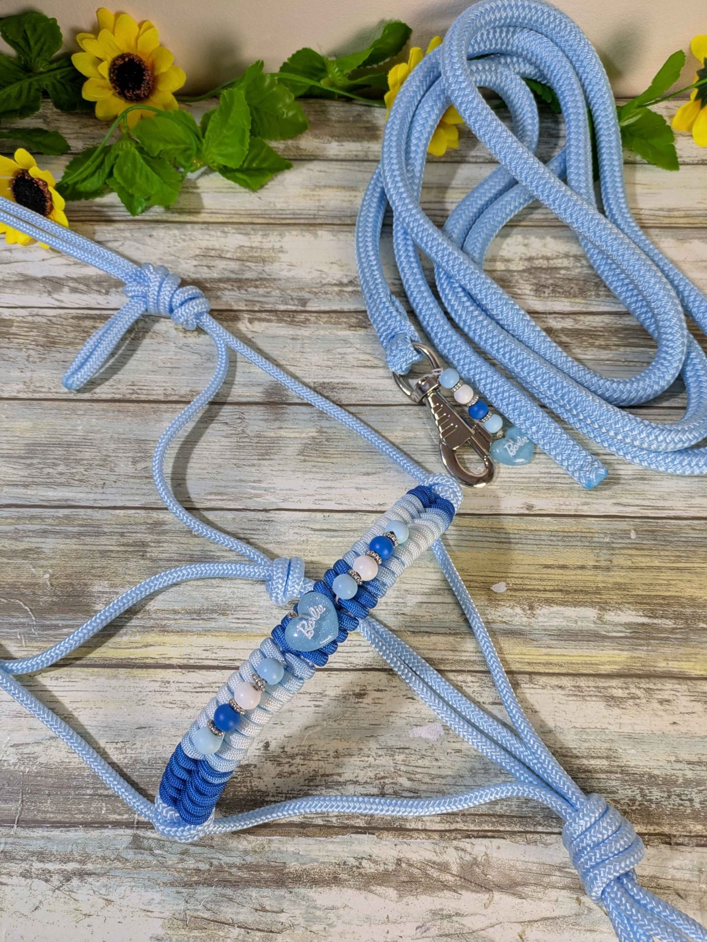 Ensemble avec licol et longe de 2m50 en corde ronde bleu clair