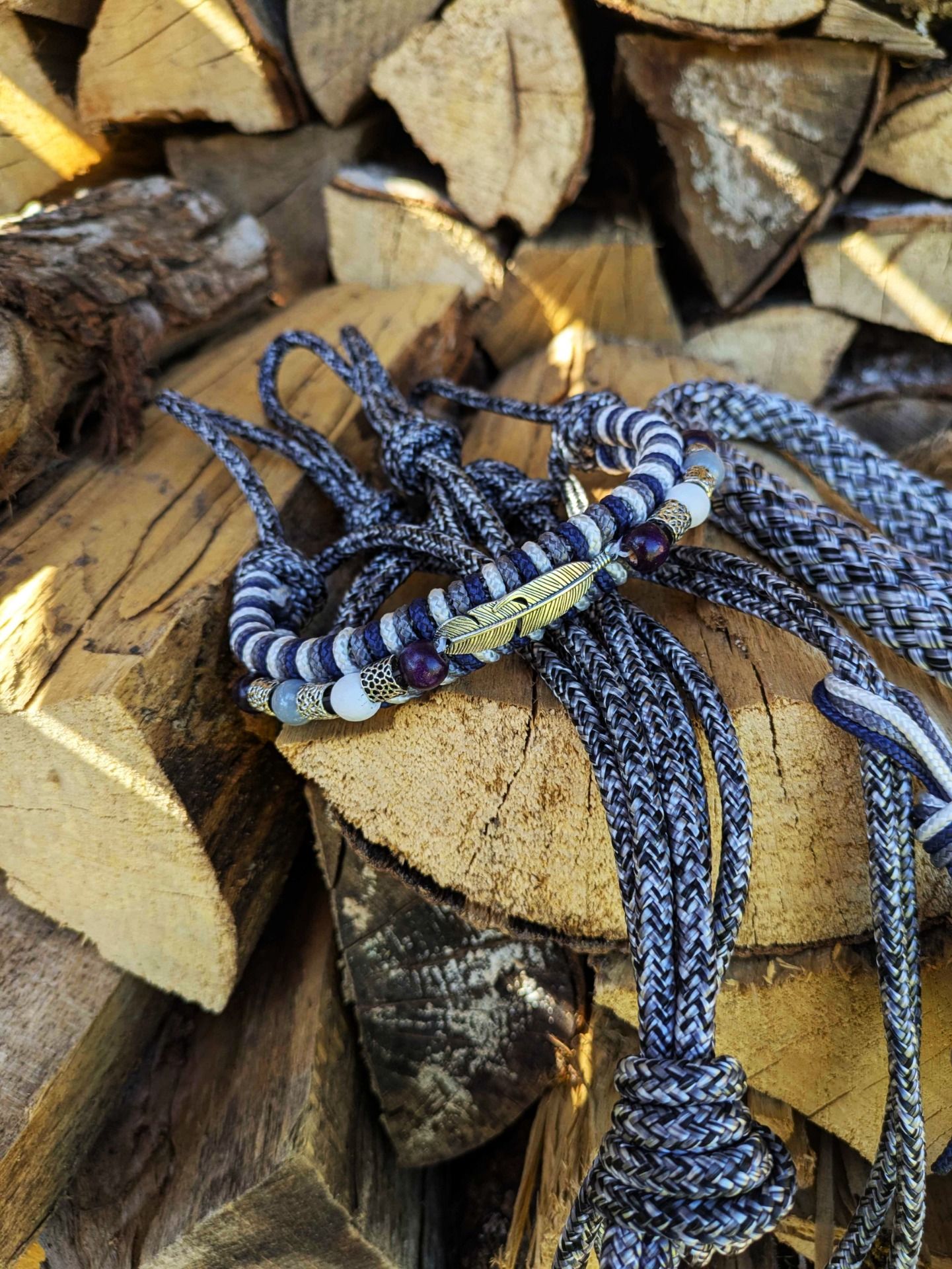 Licol gris chiné avec tressage, gris, blanc et bleu marine ainsi qu'une cordelette assortie