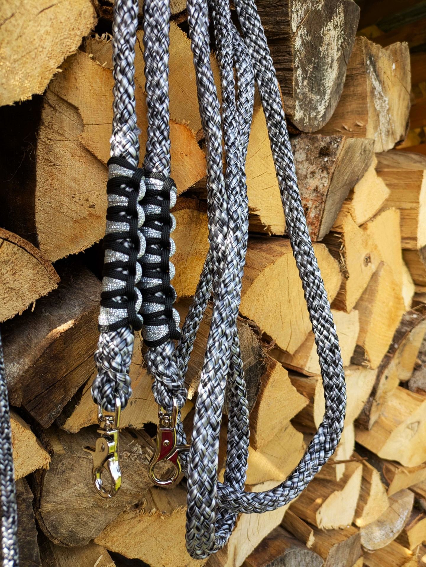 Ensemble licol, frontal et rênes en gris chiné, tressage en noir et argenté pailleté.