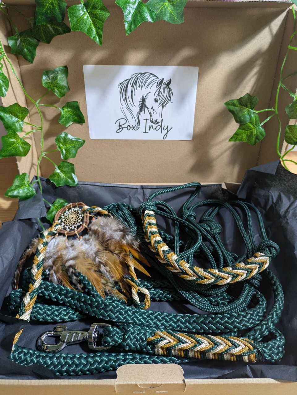 La box contient: un licol avec un frontal attrape rêves ainsi qu'un longe de 2m50
