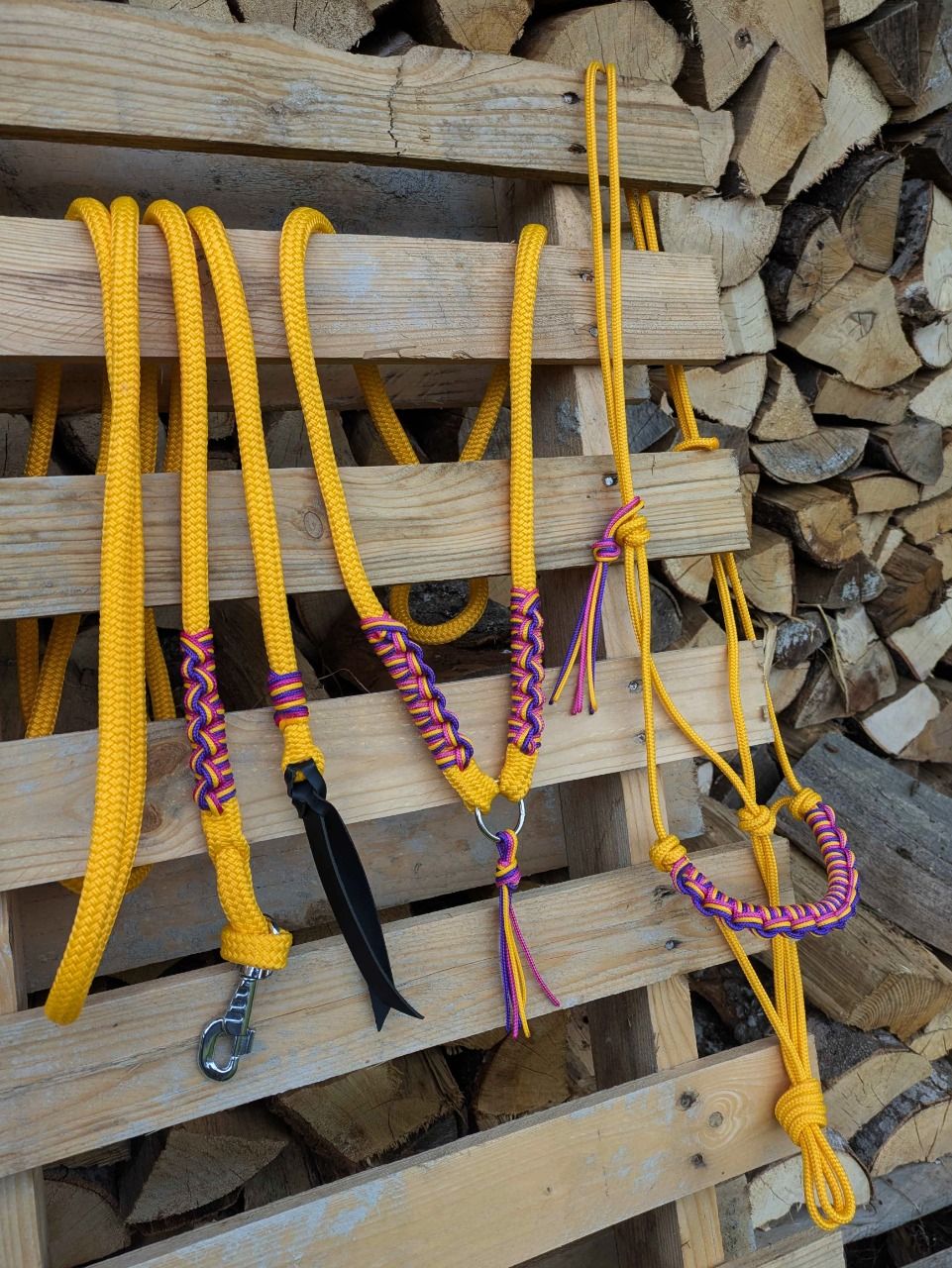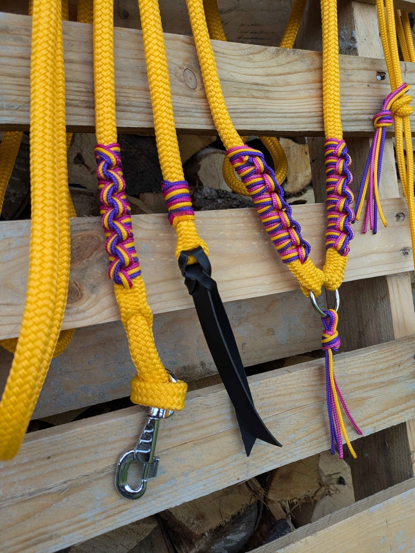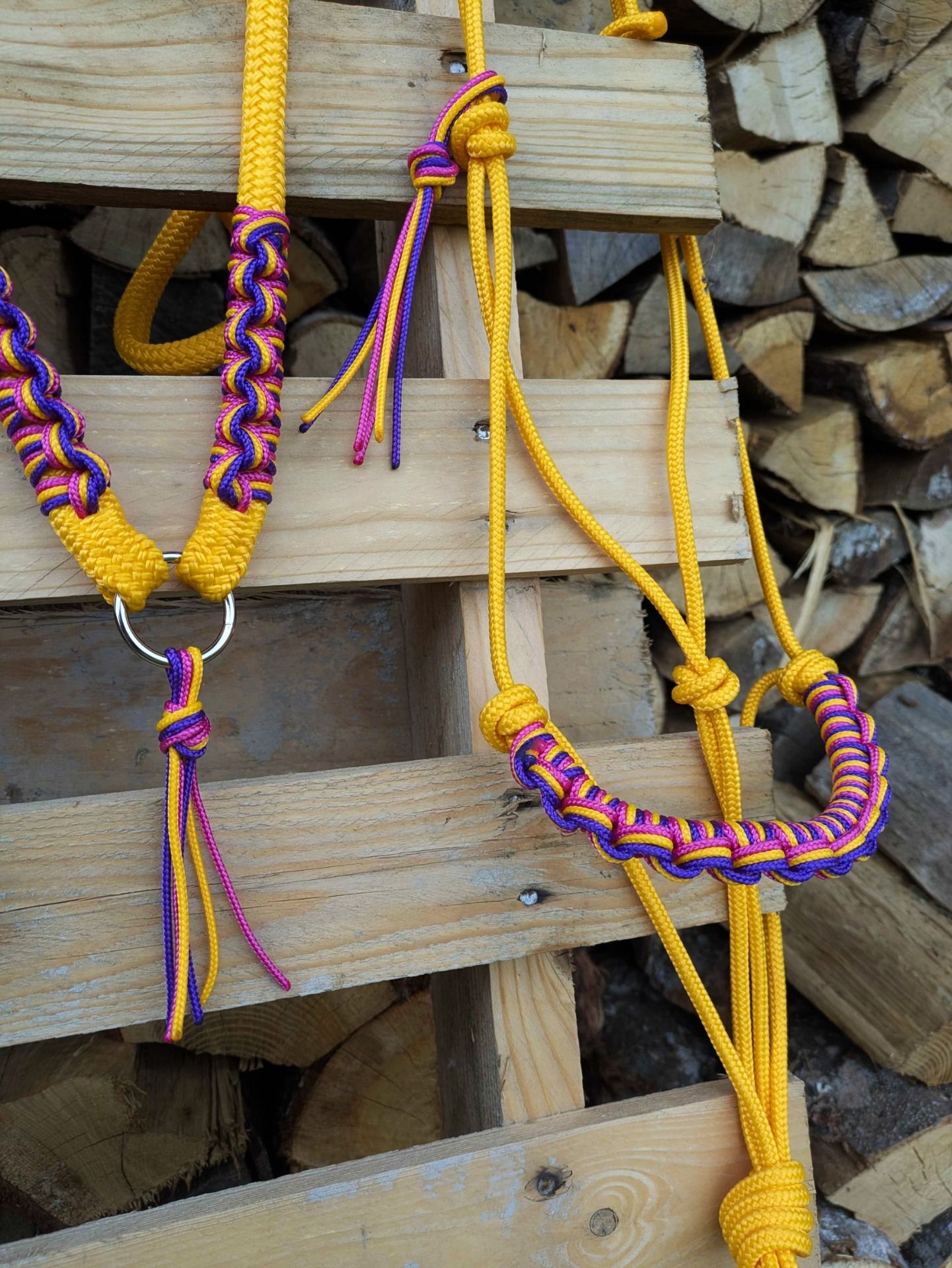 Licol, cordelette et longe de 3m70 miel avec un tressage miel, fuchsia et violet