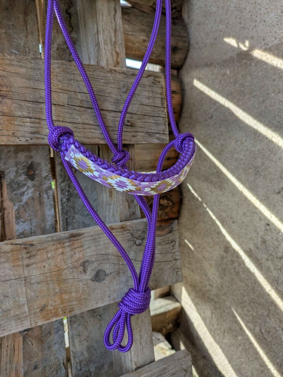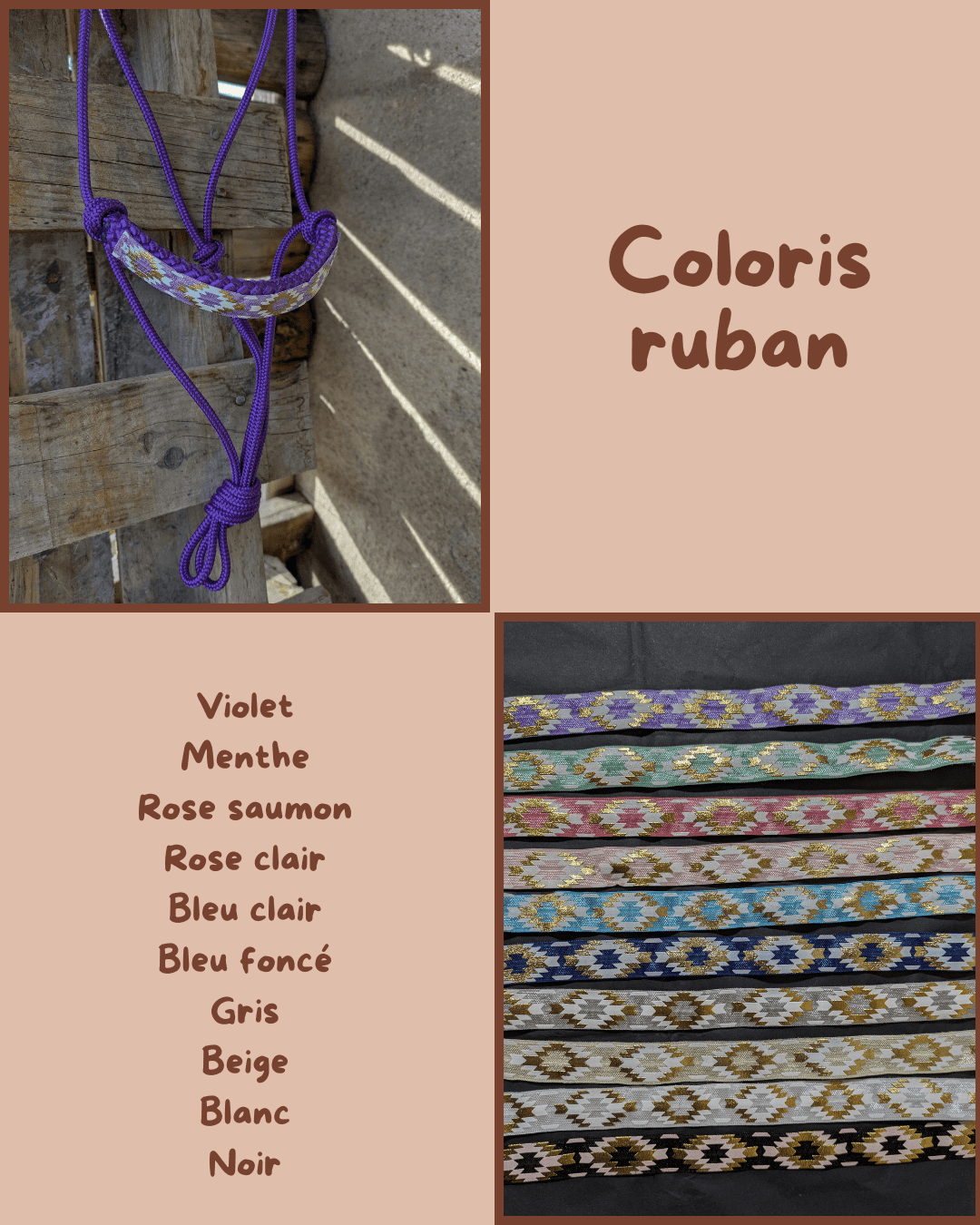 Licol en corde 6mm avec une muserolle de 12mm et un ruban cousu main