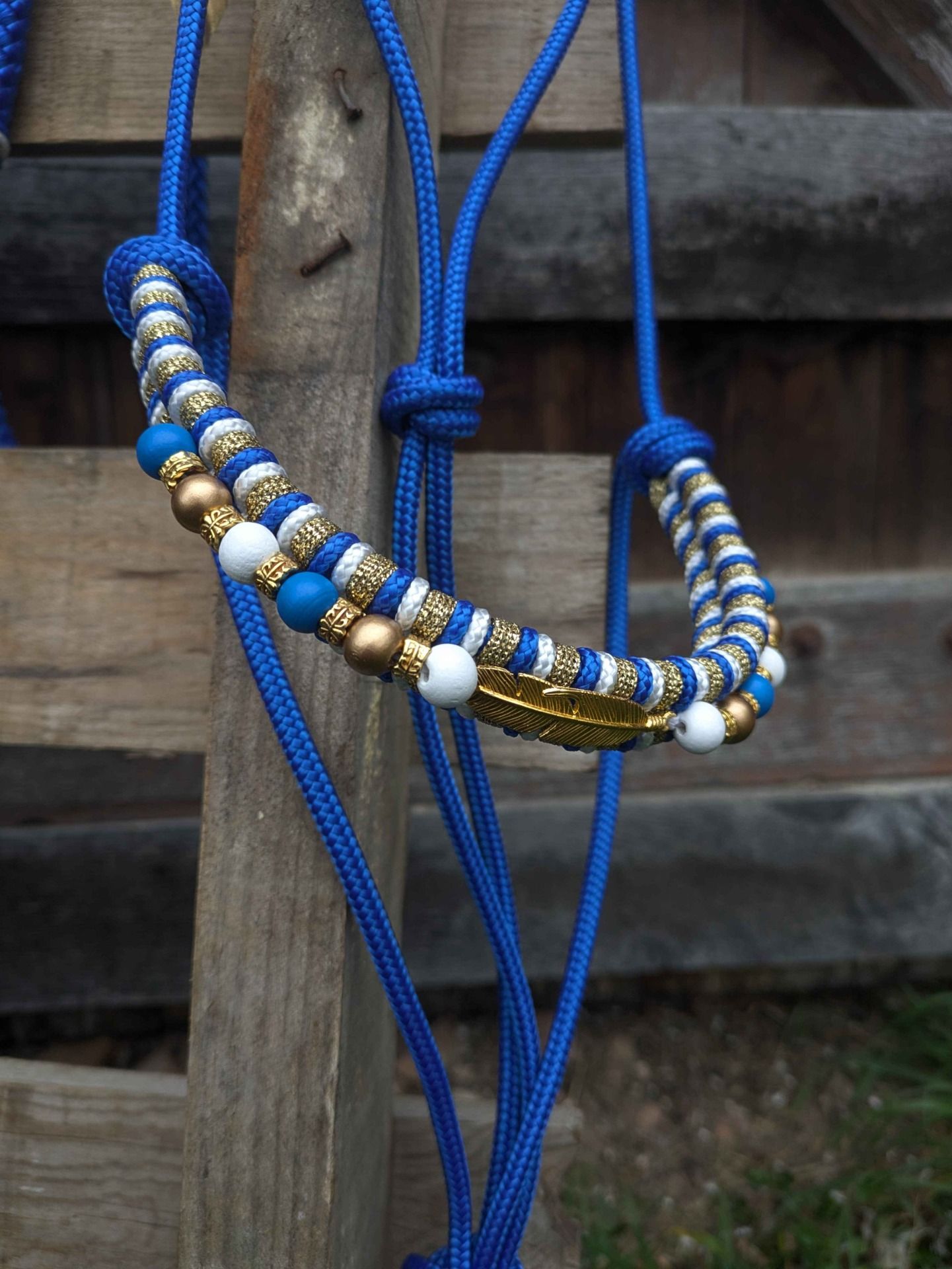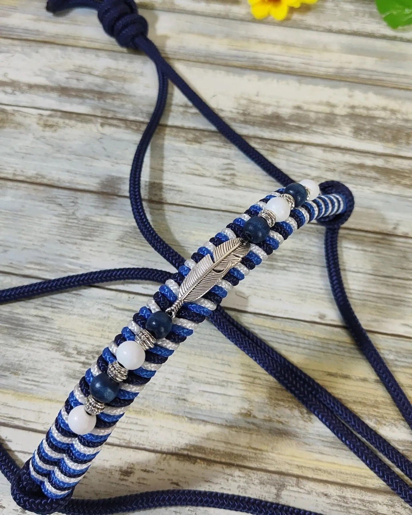 Licol en corde 6mm avec un tressage Epi de 1 à 3 couleurs (3mm), des perles au choix (grand choix de coloris), plumes et intercalaires en doré ou argenté.