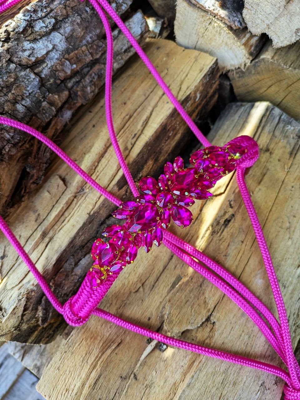 Licol en corde fuchsia avec un ornement rose sur la muserolle (cousu main)