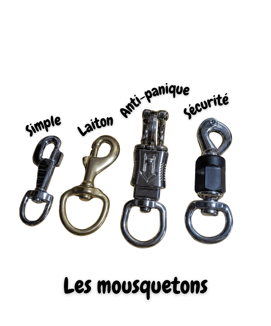 (sur demande possible d'avoir un mousqueton de sécurité, anti-panique ou laiton 5€ en supplément)